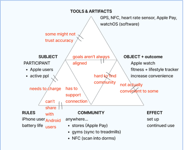 We used an activity theory framework to analyze how the Apple Watch fits into users’ lives, examining the relationships between the user, their tools (watch, app, data), and the outcomes they want to achieve.