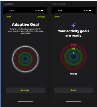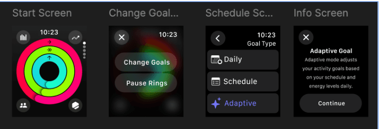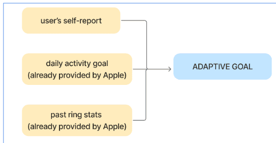 The final concept adds an “Adaptive Goal” option within the goal-change flow. Users see a quick overview of how it works, then complete a brief questionnaire to tailor their activity rings for the day.