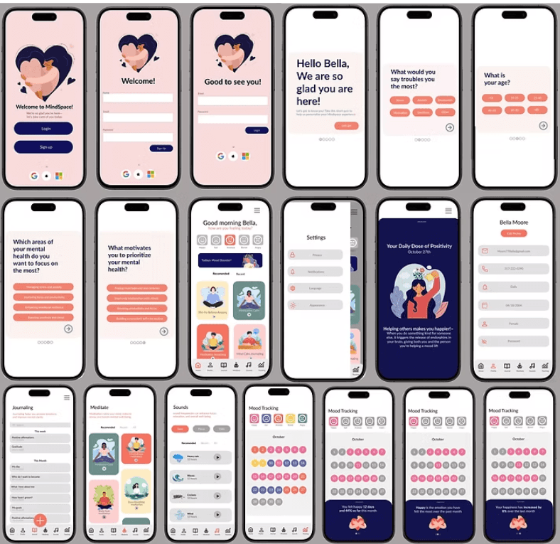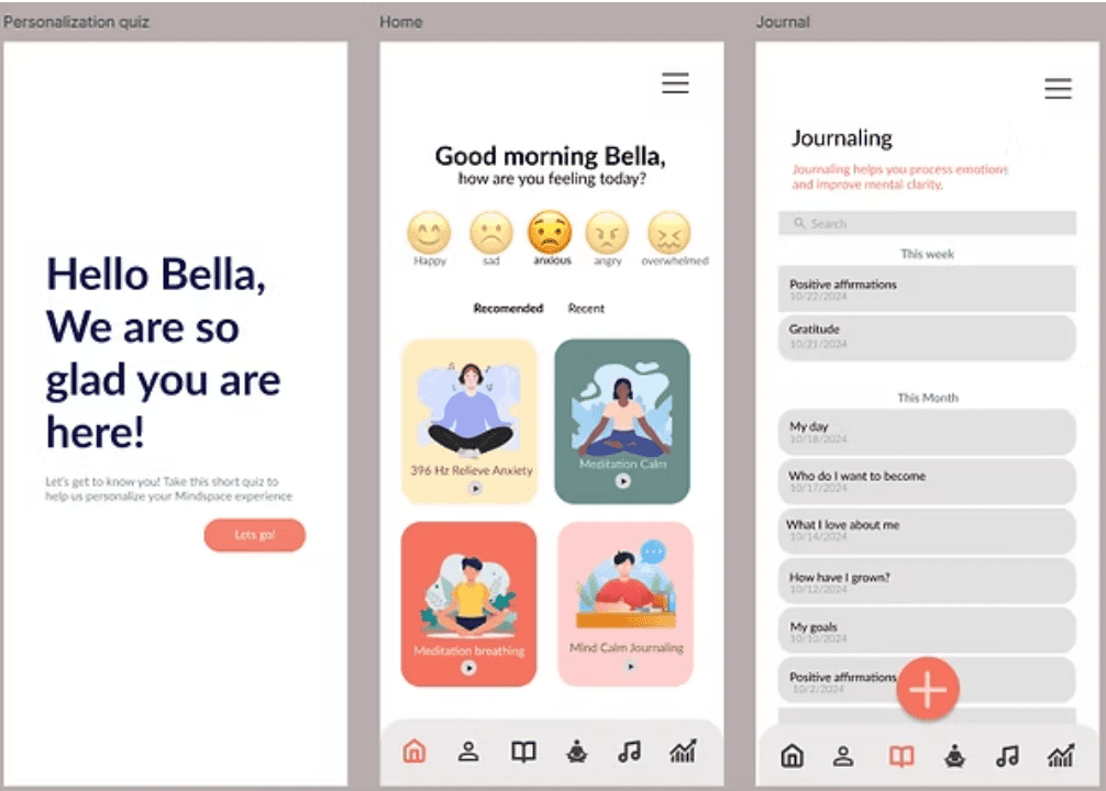 MindSpace addresses this by combining personalized mental health tools with a calm, accessible design. Features like mood tracking, journaling, and stress relief exercises empower users to build better habits and take control of their mental wellness, fitting seamlessly into their schedules.
